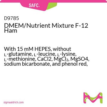 DMEM/Nutrient Mixture F-12 Ham, With 15 mM HEPES, without L-glutamine, L-leucine, L-lysine, L-methionine, CaCl2, MgCl2, MgSO4, sodium bicarbonate, and phenol red, powder, suitable for cell culture