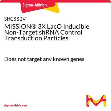 The MISSION 3x LacO Inducible Non-Target shRNA Control Transduction Particles contain an shRNA insert that does not target any known genes, making it useful as a negative control in experiments using the MISSION inducible shRNA library clones. This allows one to examine the effect of transfection of a short-hairpin on gene expression and interpret the knockdown effect seen with shRNA clones. Ampicillin and puromycin antibiotic resistance genes provide selection in bacterial or mammalian cells respectively. In addition, self-inactivating replication incompetent viral particles can be produced in packaging cells (HEK293T) by co-transfection with compatible packaging plasmids. 200 uL of 106 TU/ml (via p24 titering assay) lentiviral particles are provided as frozen stock.