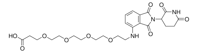 Protein degrader builiding block Pomalidomide-PEG4-CO2H enables the synthesis of molecules for targeted protein degradation and PROTAC (proteolysis-targeting chimeras) technology.This conjugate contains a Cereblon (CRBN)-recruiting ligand and a PEGylated crosslinker with pendant carboxylic acid for reactivity with an amine on the target ligand. Because even slight alterations in ligands and crosslinkers can affect ternary complex formation between the target, E3 ligase, and PROTAC, many analogs are prepared to screen for optimal target degradation. When used with other protein degrader building blocks with a pendant carboxyl group, parallel synthesis can be used to more quickly generate PROTAC libraries that feature variation in crosslinker length, composition and E3 ligase ligand.