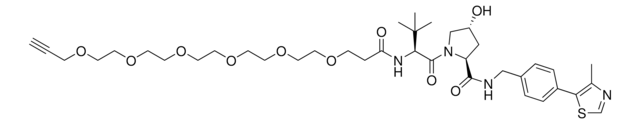 Protein degrader building block (S,R,S)-AHPC-PEG6-Alkyne enables the synthesis of molecules for targeted protein degradation and PROTAC (proteolysis-targeting chimeras) technology. This conjugate contains a von Hippel-Lindau (VHL)-recruiting ligand and a PEGylated crosslinker with pendant alkyne for click chemistry with an azide on the target ligand. Because even slight alterations in ligands and crosslinkers can affect ternary complex formation between the target, E3 ligase, and PROTAC, many analogs are prepared to screen for optimal target degradation. When used with other protein degrader building blocks with a pendant alkyne group, parallel synthesis can be used to more quickly generate PROTAC libraries that feature variation in crosslinker length, composition, and E3 ligase ligand.