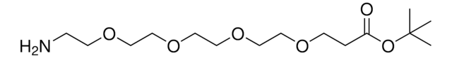This heterobifunctional, PEGylated crosslinker features an amino group at one end and t-butyl-protected carboxyl group at the other, which can be deprotected with acidic conditions. The hydrophilic PEG linker facilitates solubility in biological applications. Amino-PEG4-t-butyl ester can be used for bioconjugation or as a building block for synthesis of small molecules, conjugates of small molecules and/or biomolecules, or other tool compounds for chemical biology and medicinal chemistry that require ligation. Examples of applications include its synthetic incorporation into antibody-drug conjugates or proteolysis-targeting chimeras (PROTAC® molecules) for targeted protein degradation.