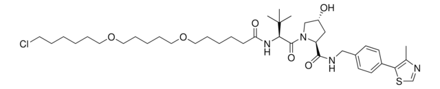 Protein degrader builiding block (S,R,S)-AHPC-C6-PEG1-C3-PEG1-butyl Chloride enables the synthesis of molecules for targeted protein degradation and PROTAC (proteolysis-targeting chimeras) technology. This conjugate contains a von Hippel–Lindau (VHL)-recruiting ligand, a linker with both hydrophobic and hydrophilic moieties, and a pendant chloroalkane for reactivity with a nucleophilic group on a target ligand. Because even slight alterations in ligands and crosslinkers can affect ternary complex formation between the target, E3 ligase, and PROTAC, many analogs are prepared to screen for optimal target degradation. When used with other protein degrader building blocks with a pendant chloro group, parallel synthesis can be used to more quickly generate PROTAC libraries that feature variation in crosslinker length, composition, and E3 ligase ligand.
