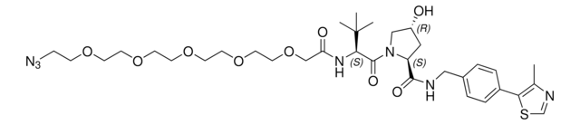 Protein degrader builiding block (S,R,S)-AHPC-PEG5-azide enables the synthesis of molecules for targeted protein degradation and PROTAC (proteolysis-targeting chimeras) technology. This conjugate contains a von Hippel-Lindau (VHL)-recruiting ligand, a linker with both hydrophobic and hydrophilic moieties, and a pendant azide for click chemistry with an alkyne on the target ligand. Because even slight alterations in ligands and crosslinkers can affect ternary complex formation between the target, E3 ligase, and PROTAC, many analogs are prepared to screen for optimal target degradation. When used with other protein degrader building blocks with a pendant azide group, parallel synthesis can be used to more quickly generate PROTAC libraries that feature variation in crosslinker length, composition, and E3 ligase ligand.