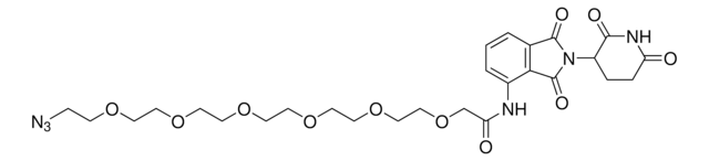 Protein degrader builiding block Pomalidomide-PEG6-Azide enables the synthesis of molecules for targeted protein degradation and PROTAC (proteolysis-targeting chimeras) technology. This conjugate contains a Cereblon (CRBN)-recruiting ligand and a PEGylated crosslinker with pendant azide for click chemistry with a target ligand. Because even slight alterations in ligands and crosslinkers can affect ternary complex formation between the target, E3 ligase, and PROTAC, many analogs are prepared to screen for optimal target degradation. When used with other protein degrader building blocks with a pendant azide group, parallel synthesis can be used to more quickly generate PROTAC libraries that feature variation in crosslinker length, composition, and E3 ligase ligand.