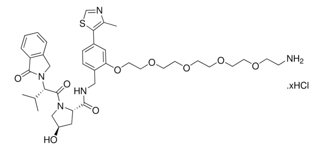 Protein degrader building block (S,R,S)-VL285 Phenol-PEG4-NH2 hydrochloride enables the synthesis of molecules for targeted protein degradation and PROTAC (proteolysis-targeting chimeras) technology. This conjugate contains a von Hippel-Lindau (VHL)-recruiting ligand with alternative exit vector from the widely used VH032 (901490), a PEG linker, and a pendant amine for reactivity with a carboxylic acid on the target ligand. Because even slight alterations in ligands and crosslinkers can affect ternary complex formation between the target, E3 ligase, and PROTAC, many analogs are prepared to screen for optimal target degradation. When used with other protein degrader building blocks with a terminal amine, parallel synthesis can be used to more quickly generate PROTAC libraries that feature variation in crosslinker length, composition, and E3 ligase ligand.