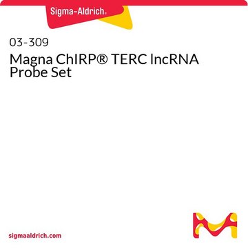 ChIRP (Chromatin Isolation by RNA Purification), allows recovery of specific segments of DNA and proteins using chromatin associated RNA as a target for biotinylated antisense probes. The Magna ChIRP TERC lncRNA Probe Set contains 19 predesigned 20-mer DNA oligonucleotides tiled along and complementary to the sequence of human lncRNA TERC. All probes are biotin-TEG-labeled at the 3-prime end. The oligonucleotides are split to two pools (even and odd) and are supplied ready-for-use by the ChIRP method. This probe set is fully compatible with the Maga ChIRP kits (cat. # 17-10494 and 17-10495).