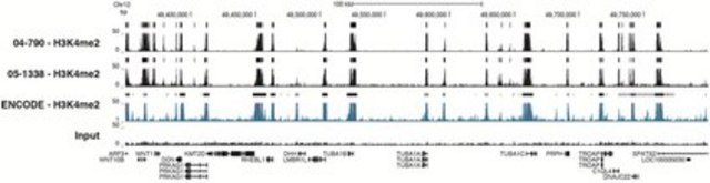 Representative lot data. Chromatin immunoprecipitation was performed using the Magna ChIP HiSens kit (cat# 17-10460), Anti-dimethyl-Histone H3 (Lys4) antibody (2 µl cat# 04-790), 20 µL Protein A/G beads, and 1e6 crosslinked HeLa cell chromatin followed by DNA purification using magnetic beads. Libraries were prepared from Input and ChIP DNA samples using standard protocols with Illumina barcoded adapters, and analyzed on Illumina HiSeq instrument. An excess of sixteen million reads from FastQ files were mapped using Bowtie (http://bowtie-bio.sourceforge.net/manual.shtml) following TagDust (http://genome.gsc.riken.jp/osc/english/dataresource/) tag removal. Peaks were identified using MACS (http://luelab.dfci.harvard.edu/MACS/), with peaks and reads visualized as a custom track in UCSC Genome Browser (http://genome.ucsc.edu) from BigWig and BED files. The highest 25% of peaks identified in the 04-790 and 05-1338 datasets showed 92 and 90% overlap with peaks identified in the ENCODE H3K4me2 BROAD Histone track for HeLa S3.