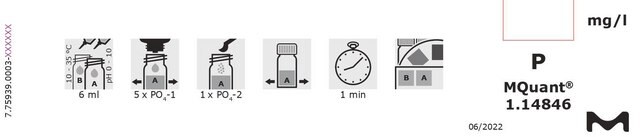 Method: colorimetric, PMB, with color-disk comparator 0.2 - 0.4 - 0.6 - 0.8 - 1.0 - 1.5 - 2.0 - 2.5 - 3.0 mg/l PO4-P MQuant®