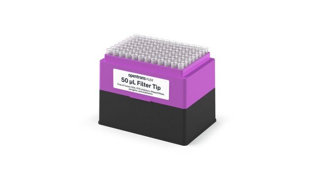 50 µL filtered pipette tips for the Opentrons Flex, provided sterile in racks or blister packs (refills). Tips are clear, non-conducting polypropylene tips, free of human DNA, PCR inhibitors, RNase/DNase, pyrogens, and endotoxins. Opentrons Flex Tips and Racks are autoclavable.