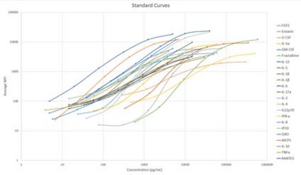 Analytes included: Eotaxin/CCL11, FGF-2, Fractalkine/CX3CL1, G-CSF, GM-CSF, GRO/KC, IFN-γ, IL-1α, IL-1β, IL-2, IL-4, IL-5, IL-6, IL-8, IL-10, IL-12 (p70), IL-13, IL-17A, IL-18, IP-10 (CXCL10), MCP-1, RANTES (CCL5), TNF-α
