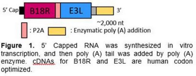 B18R-E3L RNA (human codon optimized for B18R and E3L), human codon optimized: (Cat. # CS224503), One (1) vial containing 10 µL of RNA (1 µg/µL). Store at -80 °C.