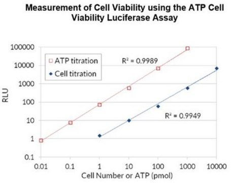 Because ATP is an indicator of metabolically active cells, the number of viable cells can be assessed based on the amount of ATP available. The ATP Cell Viability Luciferase Assay offers a highly sensitive homogenous assay for quantifying ATP in cell cultures. This kit takes advantage of Firefly luciferase’s use of ATP to oxidize D-Luciferin and the resulting production of light in order to assess the amount of ATP available in cell cultures. The sensitive assay procedure involves a single addition of ATP detection cocktail directly to cells cultured in a serum-supplemented medium. No cell washing, medium removal and multiple pipetting are required. The kit can be used to detect as little as a single cell or 0.01 picomoles of ATP. The signal produced is linear within 6 orders of magnitude. By relating the amount of ATP to the number of viable cells, the assay has wide applications, ranging from the determination of viable cell numbers to cell proliferation to cell cytotoxicity.