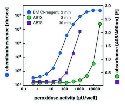 The BM Chemiluminescence ELISA Substrate (POD) provides a substrate solution for peroxidase-based (POD, HRP) secondary detection systems with highly sensitive, enhanced chemiluminescence. This reagent has been optimized for ELISA applications to be run on a microplate chemiluminescence reader (96-well format) or tube-format luminometers.