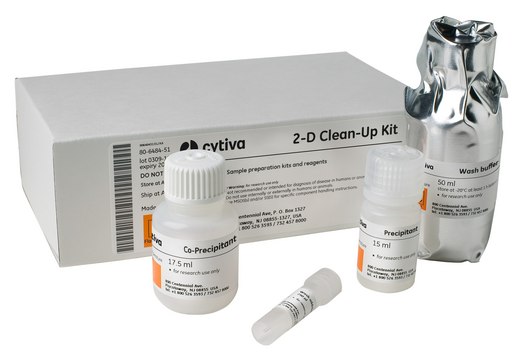 2-D Clean-Up Kit is designed to prepare samples for 2-D electrophoresis that otherwise produce poor 2-D spot-maps due to high conductivity, high levels of interfering substances, or low protein concentration. The reagents quantitatively precipitate proteins while leaving interfering substances, such as detergents, salts, lipids, phenolics, and nucleic acids, in solution.