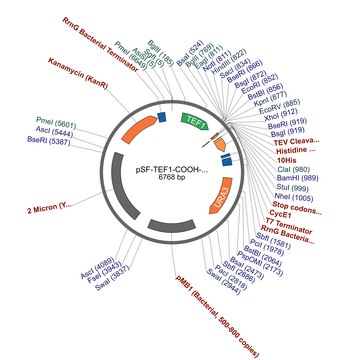 Promoter Expression Level: This plasmid contains the Yeast Elongation Factor Alpha promoter (TEF1). This is the strongest of the yeast promoters that we sell. It is a constitutive promoter and requires no induction. If you are interested in weaker promoters levels than we also stock plasmids that contain the following promoters in order of decreasing strength TPI (strong), ADHI (medium), STE5 (weak). We also stock Galactose inducible promoter plasmids if inducible expression is required. Please contact us for further information.