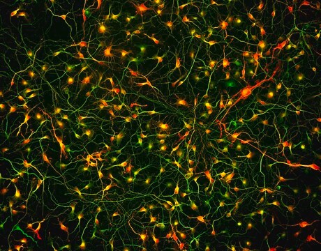 Marker Expression: Fully differentiated Cortical GABAergic Neurons have high neuronal purity (>90%) and comprise predominantly inhibitory neurons. Labeling with the pan-neuronal marker MAP2 (green) and for GABA (red) highlight the purity of this neuronal product. Morphology: Cortical GABAergic Neurons exhibit substantial neurite outgrowth within a week in culture and are adherent. Calcein staining (green) demonstrates the characteristic cell shape and extension of processes of Cortical GABAergic Neurons in culture.