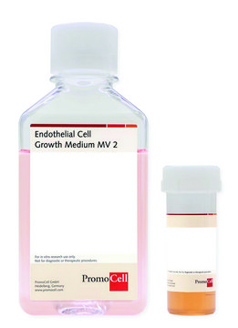 Endothelial Cell Growth Medium MV2 is a low-serum (5% V/V) medium developed for the in vitro cultivation of endothelial cells from microvascular vessels, the coronary artery, and the aorta. The medium lacks the Endothelial Cell Growth Supplement (ECGS, bovine hypothalamic extract) but contains basic Fibroblast Growth Factor, Insulin-like Growth Factor and Vascular Endothelial Growth Factor (VEGF). Because of its effects on cell metabolism, VEGF may interfere with certain experimental setups. In these cases, we recommend the use of Endothelial Cell Growth Medium MV. The media are optimized for primary human cells but can also be used for bovine, porcine, murine, rat and dog endothelial cells from microvascular vessels as well as for various endothelial cell lines.Recommended for:Human Dermal Microvascular Endothelial Cells (HDMEC)Human Coronary Artery Endothelial Cells (HCAEC)Human Aortic Endothelial Cells (HAoEC)Human Pulmonary Microvascular Endothelial Cells (HPMEC)Human Dermal Lymphatic Endothelial Cells (HDLEC)Human Dermal Blood Endothelial Cells (HDBEC)Human Cardiac Microvascular Endothelial Cells (HCMEC)Human Uterine Microvascular Endothelial Cells (HUtMEC)Note: For best transfection results we recommend using PromoCell heparin-free Endothelial Cell Growth Medium MV2. Heparin, included all our other our Endothelial Cell Growth Media formulations, may reduce transfection efficiency.
