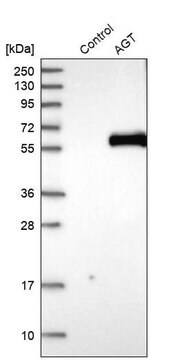 Anti-AGT antibody produced in rabbit, a Prestige Antibody, is developed and validated by the Human Protein Atlas (HPA) project . Each antibody is tested by immunohistochemistry against hundreds of normal and disease tissues. These images can be viewed on the Human Protein Atlas (HPA) site by clicking on the Image Gallery link. The antibodies are also tested using immunofluorescence and western blotting. To view these protocols and other useful information about Prestige Antibodies and the HPA, visit sigma.com/prestige.