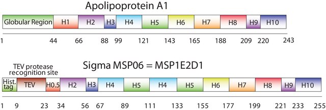 The first MSP, MSP1, was engineered with its sequence based on the sequence of A-1, but without the globular N-terminal domain of native A-1. The MSP1E2D1 variant of MSP1 differs from MSP1 in the following facets: