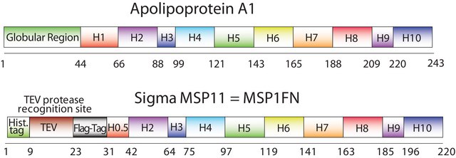 The first MSP, MSP1, was engineered with its sequence based on the sequence of A-1, but without the globular N-terminal domain of native A-1. The Membrane Scaffold Protein 1D1 (MSP1D1) variant of MSP1 deletes the first 11 amino acids in the Helix 1 portion (referred to as “H0.5” in the accompanying figure) of the original MSP1 sequence. The 1FN variant of MSP1D1 (MSP 1FN) includes an N-terminal FLAG® tag.