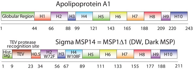 The first MSP, MSP1, was engineered with its sequence based on the sequence of A-1, but without the globular N-terminal domain of native A-1. The Membrane Scaffold Protein 1D1 (MSP1D1) variant of MSP1 deletes the first 11 amino acids in the Helix 1 portion (referred to as “H0.5” in the accompanying figure) of the original MSP1 sequence. The MSP1ΔW variant of MSP1D1, sometimes referred to as “Dark MSP”, replaces the two tryptophan (W) residues in the parent MSP1D1 sequence with phenylalanines (F). These two (W→F) substitutions are at the following positions of the original native A-1 sequence: