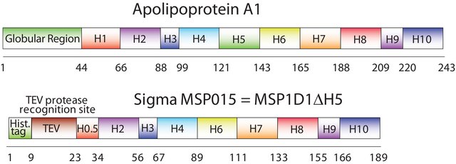 The first MSP, MSP1, was engineered with its sequence based on the sequence of A-1, but without the globular N-terminal domain of native A-1. The Membrane Scaffold Protein 1D1 (MSP1D1) variant of MSP1 deletes the first 11 amino acids in the Helix 1 portion (referred to as “H0.5” in the accompanying figure) of the original MSP1 sequence. The MSP1D1ΔH5 variant of MSP1D1 omits the 22 amino acids of the Delta-Helix 5 sequence (H5).