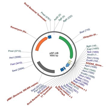 PSF-UB – ubiquitin promoter expression plasmid contains the Ub promoter upstream of the multiple cloning site (MCS) for expression in mammalian cells. Transcription termination is mediated by the SV40 poly-adenylation signals downstream of the MCS.