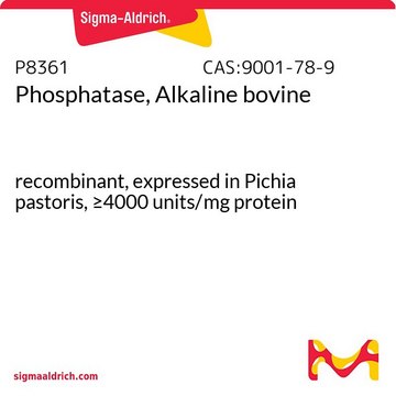 Alkaline phosphatase is used for conjugation to antibodies and other proteins for ELISA, Western blotting, and histochemical detection. It is routinely used to dephosphorylate proteins and nucleic acids. It may be used for protein labeling when high sensitivity is required. Alkaline phosphatase may be also be used to dephosphorylate the 5′-termini of DNA or RNA to prevent self-ligation. DNA or RNA can also be tagged with radiolabeled phosphate (via T4 polynucleotide kinase) after dephosphorylation with alkaline phosphatase. Product P8361 has been used to dephosphorylate Dishevelled (Dvl) , which is a key component in the Wnt/β-catenin signaling pathway.