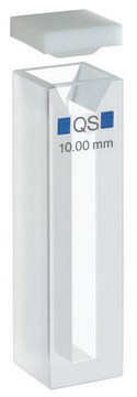 Hellma® absorption cuvettes, semi Micro with PTFE lids (spectral range 200-2,500 nm, pathlength 10 mm, chamber volume 1,400 μL) are available in high-performance Suprasil quartz material. The highest level of sensitivity in the measurement can be achieved by suitably selecting the cell for a specific application such that it exhibits high transmission in the spectral range of interest. The maximum of 80-90% transmission shown by empty Suprasil quartz cell is caused by the reflection loss at the four glass/air boundaries. When filled with common solvents, the cell will exhibit significantly higher maximum transmissions.
