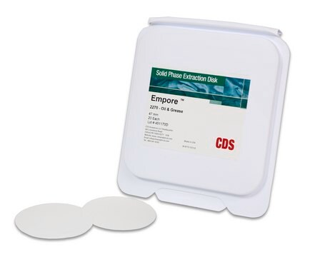The Empore line of SPE disks comprises of the most complete line of SPE disks for extracting large volumes of aqueous samples. The product line ranges from time-tested C18 to unique phase chemistries such as carbon and the highly polar Oil & Grease disk. The disks are ideal for environmental analysis where 1 L sample volumes are not uncommon and provide an efficient alternative to LLE.