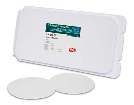 The Empore line of SPE disks comprises of the most complete line of SPE disks for extracting large volumes of aqueous samples. The product line ranges from time-tested C18 to unique phase chemistries such as carbon and the highly polar Oil & Grease disk. The disks are ideal for environmental analysis where 1 L sample volumes are not uncommon and provide an efficient alternative to LLE.