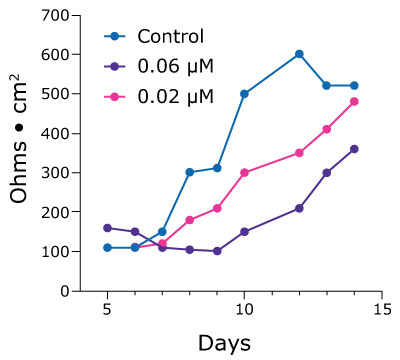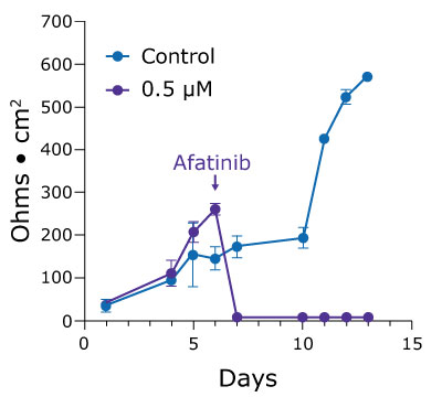 2.5D cell culture can also help researchers studying drug toxicity reveal more subtle effects that are masked by end-point cell viability assays. Poorly tolerated by the gut, the chemotherapeutic drug afatinib is highly potent but results in a 96% incidence of diarrheagenic side effects. Treating duodenum monolayers with 0.5 µM afatinib in vitro results in cell death and monolayer breakdown. However, lower concentrations demonstrate a dose-dependent lag in the increase of TEER values over time (Figure 4).