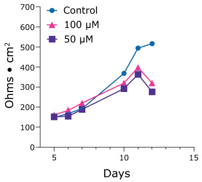 Culturing the intestinal monolayers in differentiation medium promotes formation of these specialized cells providing a more physiologically reflective model of the gut. The difference in properties between monolayers maintained in either the proliferative or differentiation medium can be seen via TEER values over time (Figure 2).