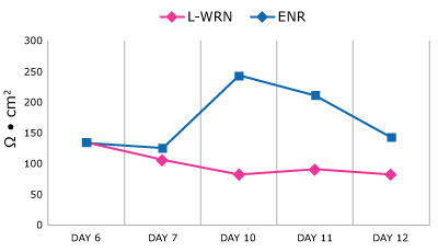 Figure 2.TEER values for Duo-87 organoids cultured on 1.0 µm pore size 96-well Millicell® plates. TEER values increase for wells switched from proliferative (L-WRN, pink) medium to differentiation (ENR, blue) medium. The L-WRN-grown Duo-87 organoids TEER values do not peak over time, while the ENR-grown Duo-87 organoids TEER values peak at day 10 and gradually decrease back down to the starting value on day 12.