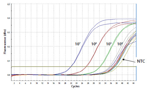 Figure 11.2.Amplification of a 10-fold serial dilution of a DNA template. The replicates are precise but the ΔCq is inconsistent, decreasing with increasing dilutions. The data also shows a positive signal in the no template control (NTC) indicating contamination or primer dimer formation and that the dilutions to less than 105 copies have identical data to the NTC.
