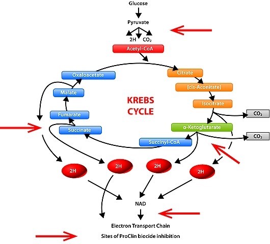 在与微生物接触后的数分钟内,活性组份就能渗透过细胞壁从而抑制Krebs循环中某些特定酶的活性(如下图红色箭头所示)。微生物的生长、大分子合成及呼吸链反应被有效地抑制,最终导致细胞死亡。ProClin™ 系列防腐剂具有多标靶作用位点,因此大大降低了因变异产生的微生物的耐药性。随着Krebs循环被阻断,细胞产生能量和合成酶等生物活性物质的能力迅速下降,但其使用剂量却保持比较低的水平,因此对人畜无害。