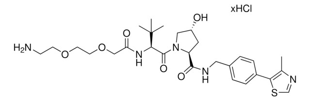 Protein degrader builiding block (S,R,S)-AHPC-PEG2-NH2 (HCl salt) enables the synthesis of molecules for targeted protein degradation and PROTAC (proteolysis-targeting chimeras) technology. This conjugate contains a von Hippel-Lindau (VHL)-recruiting ligand and a PEGylated crosslinker with pendant amine for reactivity with a carboxyl group on the target ligand. Because even slight alterations in ligands and crosslinkers can affect ternary complex formation between the target, E3 ligase, and PROTAC, many analogs are prepared to screen for optimal target degradation. When used with other protein degrader building blocks with a pendant amine, parallel synthesis can be used to more quickly generate PROTAC libraries that feature variation in crosslinker length, composition, and E3 ligase ligand.