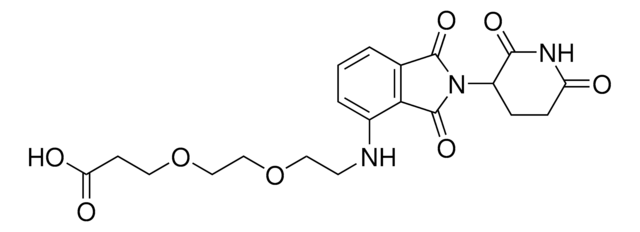 Protein degrader builiding block Pomalidomide-PEG2-CO2H enables the synthesis of molecules for targeted protein degradation and PROTAC (proteolysis-targeting chimeras) technology. This conjugate contains a Cereblon (CRBN)-recruiting ligand and a PEGylated crosslinker with pendant carboxylic acid for reactivity with an amine on the target ligand. Because even slight alterations in ligands and crosslinkers can affect ternary complex formation between the target, E3 ligase, and PROTAC, many analogs are prepared to screen for optimal target degradation. When used with other protein degrader building blocks with a pendant carboxyl group, parallel synthesis can be used to more quickly generate PROTAC libraries that feature variation in crosslinker length, composition, and E3 ligase ligand.