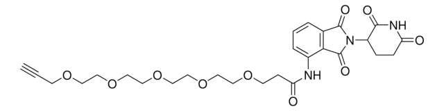 Protein degrader builiding block Pomalidomide-PEG5-Alkyne enables the synthesis of molecules for targeted protein degradation and PROTAC (proteolysis-targeting chimeras) technology. This conjugate contains a Cereblon (CRBN)-recruiting ligand and a PEGylated crosslinker with pendant alkyne for click chemistry with an azide on the target ligand. Because even slight alterations in ligands and crosslinkers can affect ternary complex formation between the target, E3 ligase, and PROTAC, many analogs are prepared to screen for optimal target degradation. When used with other protein degrader building blocks with a pendant alkyne group, parallel synthesis can be used to more quickly generate PROTAC libraries that feature variation in crosslinker length, composition, and E3 ligase ligand.