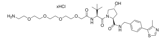 Protein degrader builiding block (S,R,S)-AHPC-PEG4-NH2 (HCl salt) enables the synthesis of molecules for targeted protein degradation and PROTAC (proteolysis-targeting chimeras) technology. This conjugate contains a von Hippel-Lindau (VHL)-recruiting ligand and a PEGylated crosslinker with pendant amine for reactivity with a carboxyl group on the target ligand. Because even slight alterations in ligands and crosslinkers can affect ternary complex formation between the target, E3 ligase, and PROTAC, many analogs are prepared to screen for optimal target degradation. When used with other protein degrader building blocks with a pendant amine, parallel synthesis can be used to more quickly generate PROTAC libraries that feature variation in crosslinker length, composition, and E3 ligase ligand.