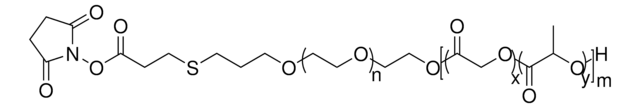 N-Hydroxysuccinimide poly(ethylene glycol)-block-poly(lactide-co-glycolide) is a N-hydroxysuccinimide (NHS)-functionalized, biocompatible, amphiphilic block copolymer. Due to its self-assembling properties, this material can be used in the formation of nanoparticles for drug delivery. Additionally, due to the NHS-functionalization of the PEG block, this material can be used to rapidly covalently conjugate biomolecules, API, or targeting ligands. Potential uses include the targeted and/or controlled release of cancer drugs, anti-inflammatory drugs, antibiotics, or anesthetic agents.