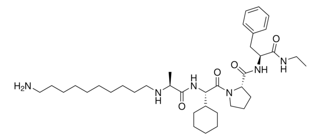 Protein degrader building block A1V2PF1-NHEt-C10-NH2 enables the synthesis of molecules for targeted protein degradation and SNIPER (specific and non-genetic inhibitor of apoptosis protein (IAP)-dependent protein erasers) technology. Developed in partnership with ComInnex, this conjugate contains an in silico-derived IAP-recruiting ligand, an alkyl-chain crosslinker, and a pendant amine for reactivity with an acid on a target warhead. Because even slight alterations in ligands and crosslinkers can affect ternary complex formation between the target, E3 ligase, and protein degrader, many analogs are prepared to screen for optimal target degradation. When used with other protein degrader building blocks with a terminal amine, including CRBN and VHL targeted, parallel synthesis can be used to more quickly generate SNIPER and PROTAC® degrader libraries that feature variation in crosslinker length, composition, and E3 ligase ligand. Learn more about the novel IAP ligands generated through virtual screening of AVP mimetics in our Technology Spotlight.