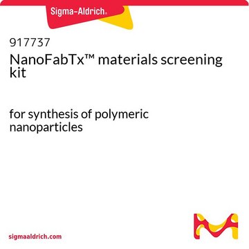 The NanoFabTx™ materials screening kit, for synthesis of polymeric nanoparticles, is a ready-to-use nanoformulation kit for the synthesis of nanoparticles for drug delivery. Poly(lactic-co-glycolic acid) (PLGA), poly(D,L-lactic acid) (PLA) and polycaprolactone (PCL) are biocompatible and biodegradable polymers that have been approved by the FDA for biomedical and pharmaceutical applications. This kit includes properly selected PLGA, PLA, and PCL polymers and stabilizer, allowing for rapid screening of optimal materials for enhanced drug loading and controlled drug release.