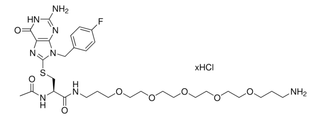 Protein degrader building block FBnG-C3-PEG5-C3-NH2 hydrochloride enables the synthesis of molecules for degradation of proteins and PROTAC® (proteolysis-targeting chimeras) research. This conjugate contains a p-fluorobenzylguanine (FBnG) ligand, a PEG linker, and a pendant amine for reactivity with a carboxylic acid on the target ligand. Because even slight alterations in ligands and crosslinkers can affect ternary complex formation between the target, E3 ligase, and degrader, many analogs are prepared to screen for optimal target degradation. When used with other protein degrader building blocks with a terminal amine, parallel synthesis can be used to more quickly generate degrader libraries that feature variation in crosslinker length, composition, and E3 ligase ligand.