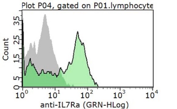 Flow Cytometry Analysis: 0.25 µg of this antibody from a representative lot detected IL-7Ra (CD127) in 1X10E6 human peripheral blood mononuclear cells (PBMCs).