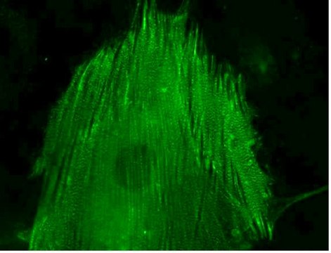 REF52 cells were plated in a chamber slide and transduced with lentiviral particles at an MOI of 20 for 24 hours. After media replacement and 48 hours further incubation, cells were fixed with formaldehyde and mounted. Images were obtained by oil immersion wide-field fluorescence microscopy. The α-actinin-GFP appears in a periodic distribution along microfilamentous structures.