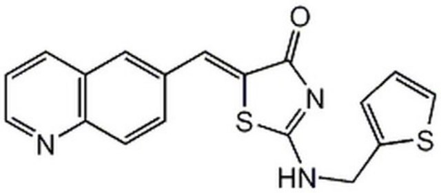 A cell-permeable quinolinyl thiazolinone compound that acts as a potent and ATP-competitive inhibitor of Cdk1 (Ki = 35 nM and 110 nM for Cdk1/B1 and Cdk1/A, respectively). It affects Cdk2/E, PKCδ, and SGK only at much higher concentrations (Ki = 340, 318, and 497 nM, respectively), and shows little effect against Cdk4/D and six other commonly studied kinases (Ki ≥ 2 µM). Short-term treatment for up to 20 hrs results in fully reversible G2/M cell cycle arrest, while prolonged treament (>48 hrs) results in apoptotic cell death in proliferating cancer cells, but not in nontumorigenic epithelial cell lines. Also available as a 10 mM solution in DMSO (Cat. No. 217721).