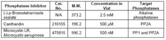 A cocktail of three inhibitors that will inhibit alkaline phosphatases as well as serine/threonine protein phosphatases such as PP1 and PP2A. This product is provided as a set of five 1 ml vials. Each vial contains 1 ml phosphatase inhibitor cocktail solubilized in DMSO with the following components: Bromotetramisole oxalate (2.5 mM), Cantharidin (Cat. No. 210155; 500 µM), and Microcystin-LR (Cat. No. 475815; 500 nM).