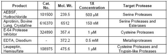 蛋白酶抑制剂混合液Set I A 是一种专门配制的混合液,含有可抑制各种蛋白酶和酯酶的五种不同蛋白酶抑制剂。