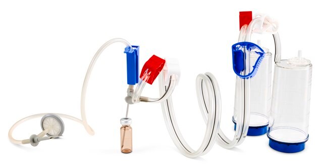 Blue base canister with a single needle for transfer into and out of ampoules.